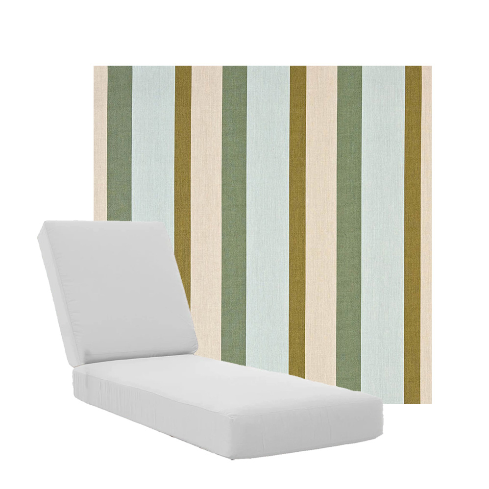 Boxed Chaise Lounge Cushions in Sunbrella Fabrics. Separate Seat and Back Cushions. Available in 3 sizes to fit a variety of outdoor furniture styles. Our boxed Chaise Lounge Cushions feature foam and fiber, piping and zipper openings. All chaise lounge replacement cushions are custom made to order in your choice of fabric and size. Made in the USA. Lead times may vary depending on the time of year.