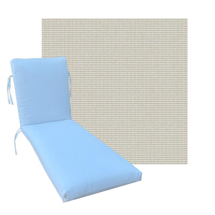 Classic Style Chaise Lounge Cushion. Premium Universal Chaise Lounge Replacement Cushions in 3 common sizes. Simple center seam design. No piping. Designed to accommodate aluminum, wood, and PVC furniture. Includes fabric ties at back and hinge. Polyester/densified fiber fill.