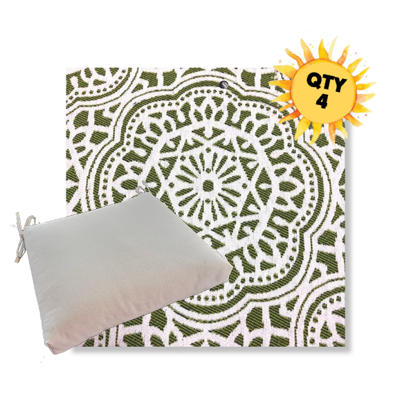 Each cushion is available in 4 universal sizes so you can choose the best fit for your existing outdoor dining furniture. A generous set of fabric ties keeps the cushion securely in place, even when people shift and move during meals. The interior features a combination of outdoor-rated foam and plush polyester fiber, creating a seat that feels soft yet supportive and holds its shape over time.