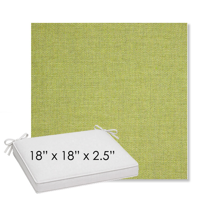 18" x 18" x 2.5" Thick outdoor dining chair seat cushion designed for a simple, ready-to-order fit. Features a boxed construction with piping, fabric ties, and zipper opening. Made in 700+ Sunbrella® fabrics for long-lasting outdoor performance.