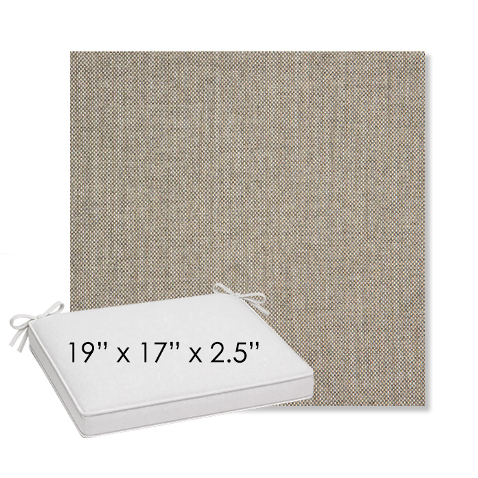 19" x 17" x 2.5" Thick outdoor dining chair seat cushion designed for a simple, ready-to-order fit. Features a boxed construction with piping, fabric ties, and zipper opening. Made in 700+ Sunbrella® fabrics for long-lasting outdoor performance.