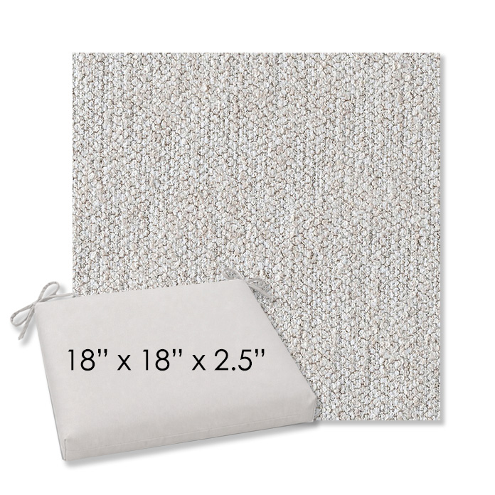 18" x 18" x 2.5" Thick - Universal outdoor dining chair seat cushion in Sunbrella Solution Dyed Polyester Outdoor Fabrics. Features with generous fabric ties and outdoor foam with polyester fiber fill—perfect for most patio dining chairs. Each Outdoor Patio Dining Chair Cushion is a center seam design and 2.5" Thick. All patio dining chair cushions are custom made to order in the size and fabric of your choice.