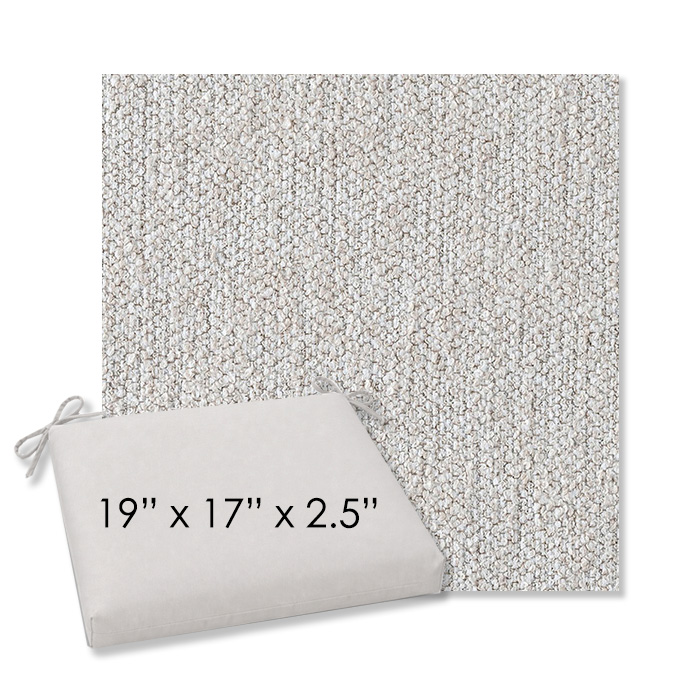 19" x 17" x 2.5" Thick - Universal outdoor dining chair seat cushion in Sunbrella Solution Dyed Polyester Outdoor Fabrics. Features with generous fabric ties and outdoor foam with polyester fiber fill—perfect for most patio dining chairs. Each Outdoor Patio Dining Chair Cushion is a center seam design and 2.5" Thick. All patio dining chair cushions are custom made to order in the size and fabric of your choice.
