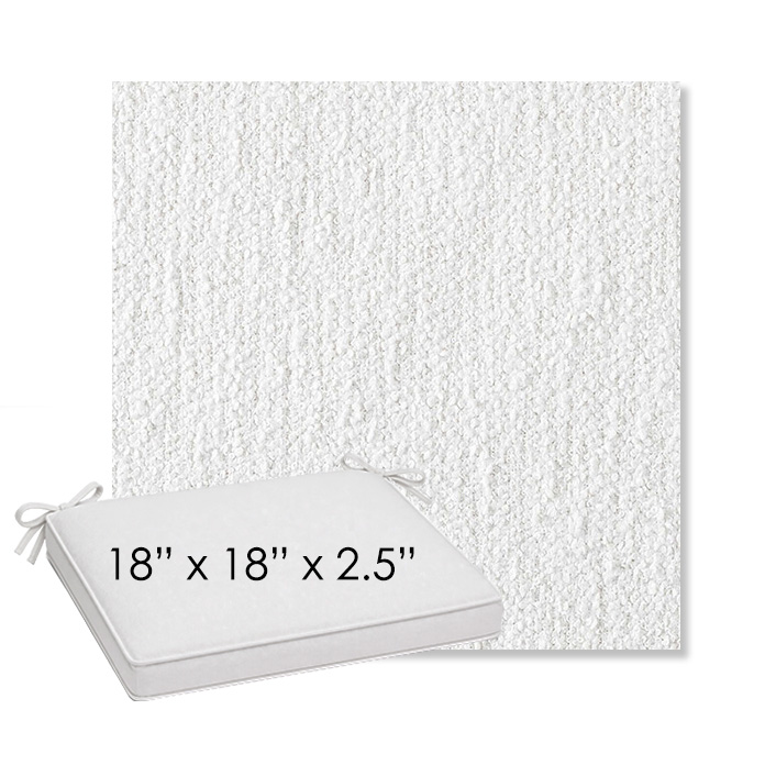 18" x 18" x 2.5" Thick outdoor dining chair seat cushion designed for a simple, ready-to-order fit. Features a boxed construction with piping, fabric ties, and zipper opening. Made in 700+ Sunbrella® fabrics for long-lasting outdoor performance.