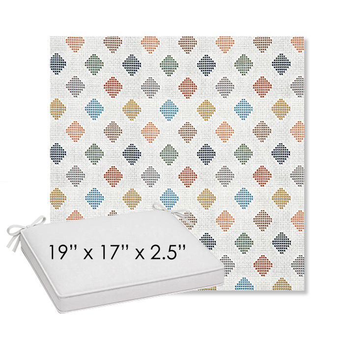 19" x 17" x 2.5" Thick outdoor dining chair seat cushion designed for a simple, ready-to-order fit. Features a boxed construction with piping, fabric ties, and zipper opening. Made in 700+ Sunbrella® fabrics for long-lasting outdoor performance.