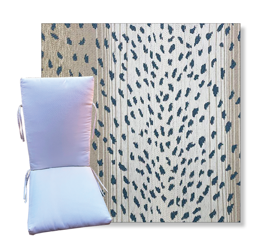 Order universal patio chair cushions in Revolution Outdoor Fabrics - Find a new colorful replacement cushion in 9 sizes - This style of patio chair cushion features a center seam, hinged design with fabric ties. These outdoor cushions are custom made to order in the fabric and size you need.