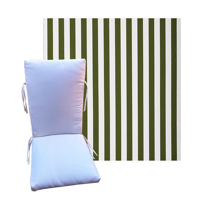 Order universal patio chair cushions in Outdura Outdoor Fabrics - Find a new colorful replacement cushion in 9 sizes - This style of patio chair cushion features a center seam, hinged design with fabric ties. These outdoor cushions are custom made to order in the fabric and size you need. See details on available sizes in the overview section below. BUY MORE and save.