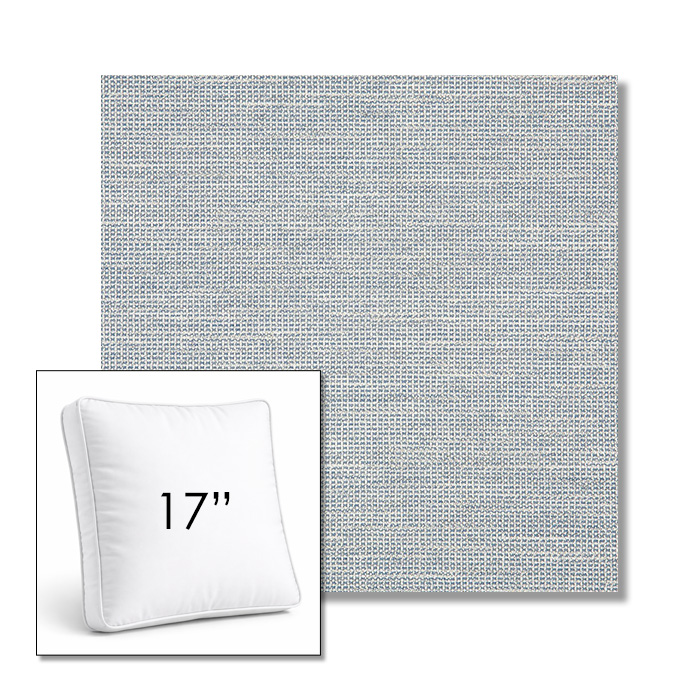 Custom 17" Square Boxed Sunbrella® Outdoor Pillow (3" Thick) available in over 700 Sunbrella® fabrics. Comes standard with piping. Optional covered button detail. Each pillow includes a zipper opening and premium outdoor insert for comfort, durability, and long-lasting outdoor performance.