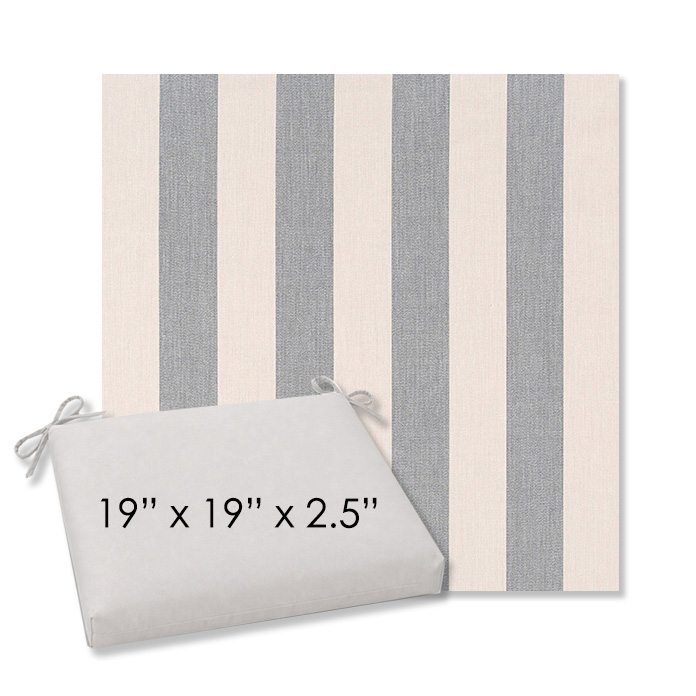 19" x 19" x 2.5" Thick - Universal outdoor dining chair seat cushion in Sunbrella Solution Dyed Polyester Outdoor Fabrics. Features with generous fabric ties and outdoor foam with polyester fiber fill—perfect for most patio dining chairs. Each Outdoor Patio Dining Chair Cushion is a center seam design and 2.5" Thick. All patio dining chair cushions are custom made to order in the size and fabric of your choice.