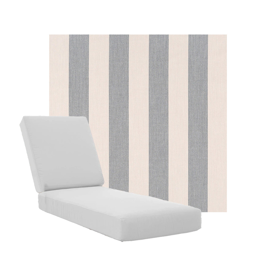 Boxed Chaise Lounge Cushions in Sunbrella Fabrics. Separate Seat and Back Cushions. Available in 3 sizes to fit a variety of outdoor furniture styles. Our boxed Chaise Lounge Cushions feature foam and fiber, piping and zipper openings. All chaise lounge replacement cushions are custom made to order in your choice of fabric and size. Made in the USA. Lead times may vary depending on the time of year.