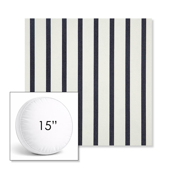 Custom 15" Round Boxed Sunbrella® Outdoor Pillow (3" Thick) available in over 700 Sunbrella® fabrics. Comes standard with piping. Optional covered button detail. Each pillow includes a zipper opening and premium outdoor insert for comfort, durability, and long-lasting outdoor performance.