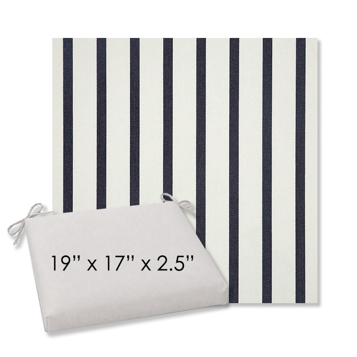 19" x 17" x 2.5" Thick - Universal outdoor dining chair seat cushion in Sunbrella Solution Dyed Polyester Outdoor Fabrics. Features with generous fabric ties and outdoor foam with polyester fiber fill—perfect for most patio dining chairs. Each Outdoor Patio Dining Chair Cushion is a center seam design and 2.5" Thick. All patio dining chair cushions are custom made to order in the size and fabric of your choice.