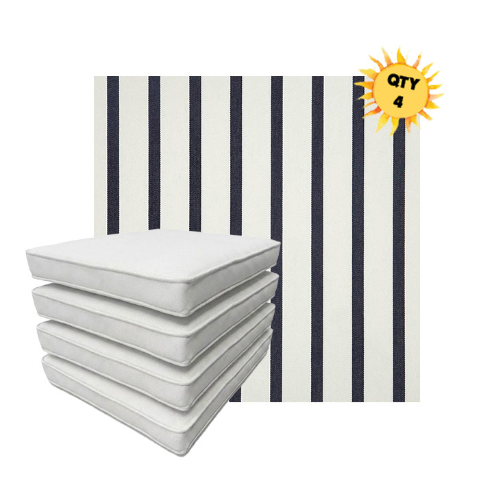 Bundle and save with custom outdoor dining chair seat cushions. Boxed and double piped, these patio dining cushions are an elegant and simple way to update your outdoor dining space. Available in 4 sizes, each dining chair seat cushion includes a zipper opening and fabric ties. Bundles in sets of 4, the more sets you buy, the more your save. Available in hundreds of Sunbrella outdoor fabrics, each patio dining chair cushion is custom made to order in the size you need and that fabric of your choice.