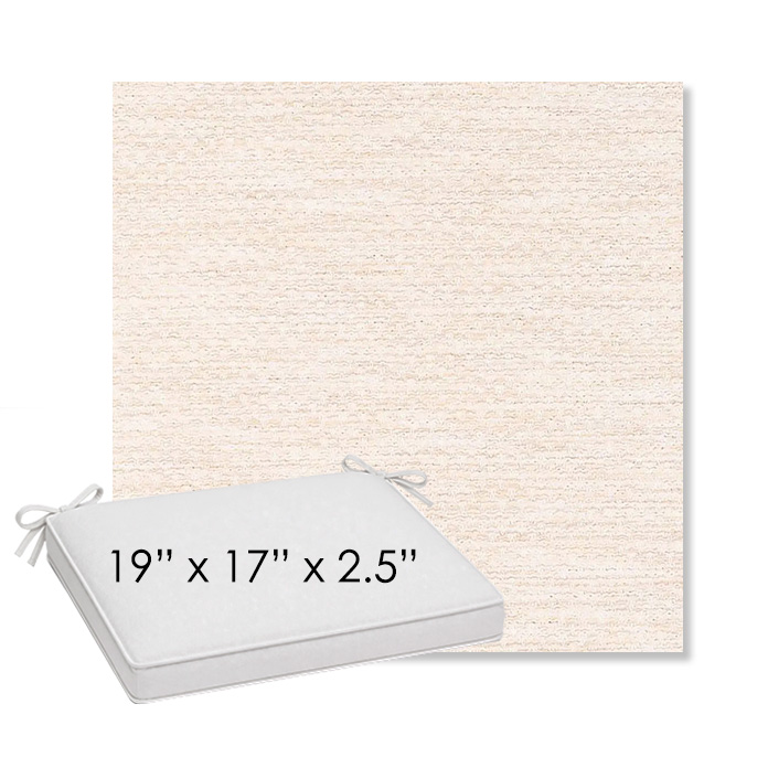 19" x 17" x 2.5" Thick outdoor dining chair seat cushion designed for a simple, ready-to-order fit. Features a boxed construction with piping, fabric ties, and zipper opening. Made in 700+ Sunbrella® fabrics for long-lasting outdoor performance.