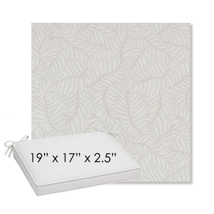 19" x 17" x 2.5" Thick outdoor dining chair seat cushion designed for a simple, ready-to-order fit. Features a boxed construction with piping, fabric ties, and zipper opening. Made in 700+ Sunbrella® fabrics for long-lasting outdoor performance.