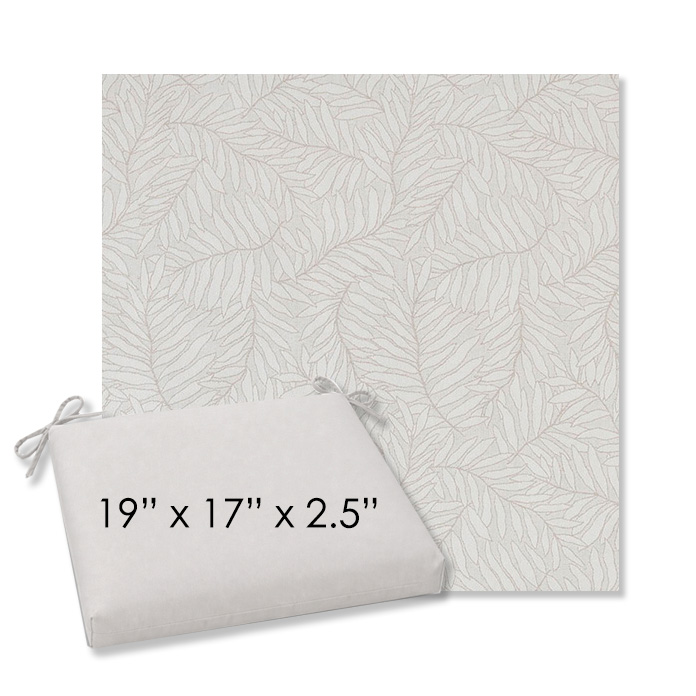 19" x 17" x 2.5" Thick - Universal outdoor dining chair seat cushion in Sunbrella Solution Dyed Polyester Outdoor Fabrics. Features with generous fabric ties and outdoor foam with polyester fiber fill—perfect for most patio dining chairs. Each Outdoor Patio Dining Chair Cushion is a center seam design and 2.5" Thick. All patio dining chair cushions are custom made to order in the size and fabric of your choice.