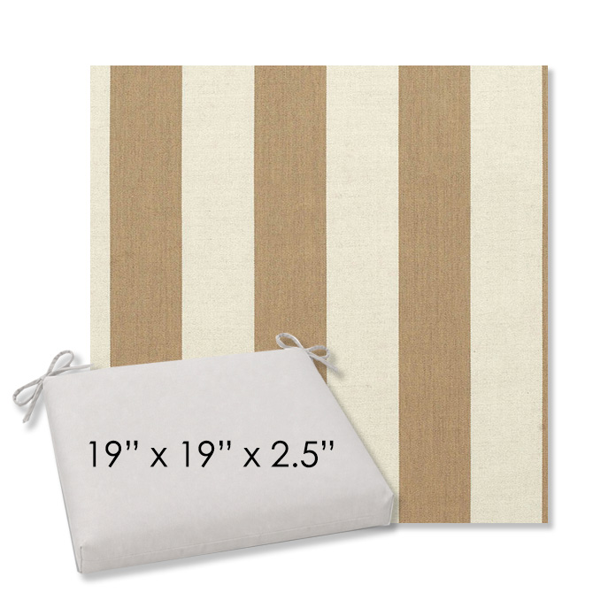 19" x 19" x 2.5" Thick - Universal outdoor dining chair seat cushion in Sunbrella Solution Dyed Polyester Outdoor Fabrics. Features with generous fabric ties and outdoor foam with polyester fiber fill—perfect for most patio dining chairs. Each Outdoor Patio Dining Chair Cushion is a center seam design and 2.5" Thick. All patio dining chair cushions are custom made to order in the size and fabric of your choice.