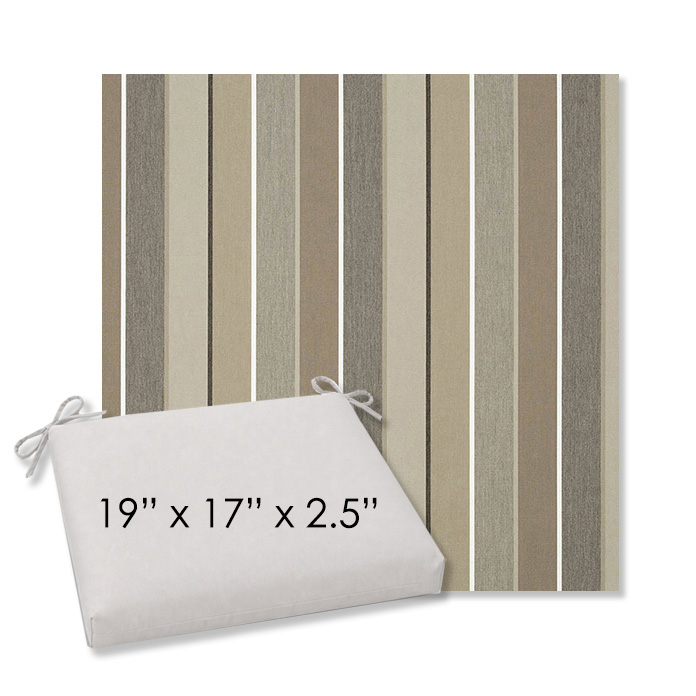 19" x 17" x 2.5" Thick - Universal outdoor dining chair seat cushion in Sunbrella Solution Dyed Polyester Outdoor Fabrics. Features with generous fabric ties and outdoor foam with polyester fiber fill—perfect for most patio dining chairs. Each Outdoor Patio Dining Chair Cushion is a center seam design and 2.5" Thick. All patio dining chair cushions are custom made to order in the size and fabric of your choice.