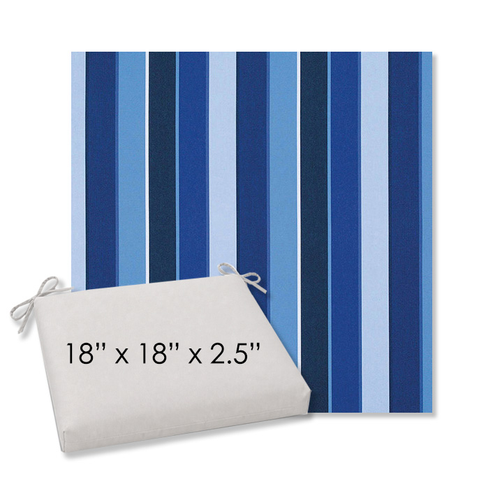 18" x 18" x 2.5" Thick - Universal outdoor dining chair seat cushion in Sunbrella Solution Dyed Polyester Outdoor Fabrics. Features with generous fabric ties and outdoor foam with polyester fiber fill—perfect for most patio dining chairs. Each Outdoor Patio Dining Chair Cushion is a center seam design and 2.5" Thick. All patio dining chair cushions are custom made to order in the size and fabric of your choice.