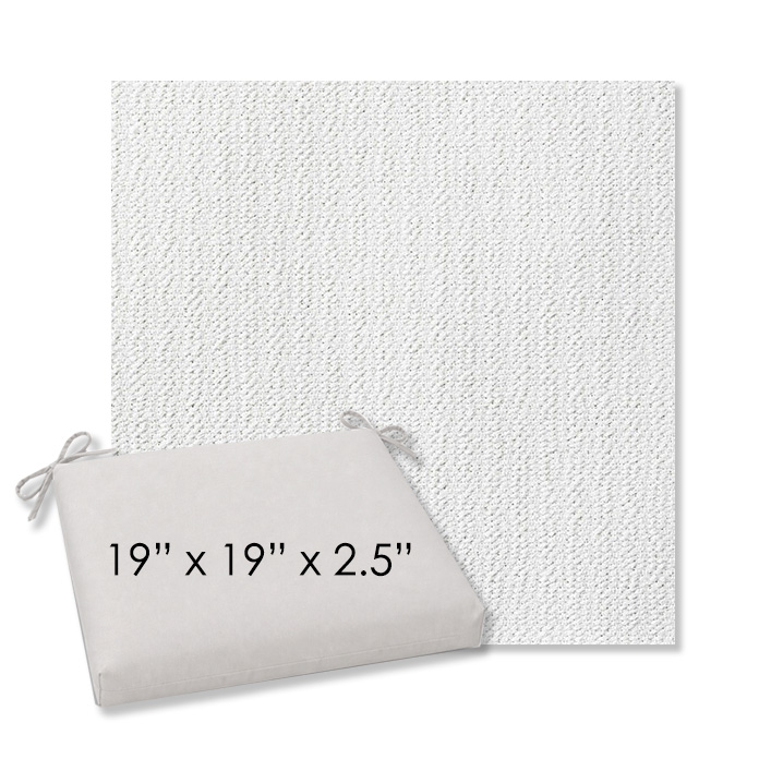 19" x 19" x 2.5" Thick - Universal outdoor dining chair seat cushion in Sunbrella Solution Dyed Polyester Outdoor Fabrics. Features with generous fabric ties and outdoor foam with polyester fiber fill—perfect for most patio dining chairs. Each Outdoor Patio Dining Chair Cushion is a center seam design and 2.5" Thick. All patio dining chair cushions are custom made to order in the size and fabric of your choice.