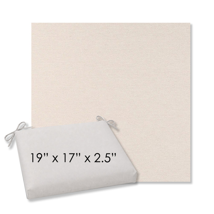 19" x 17" x 2.5" Thick - Universal outdoor dining chair seat cushion in Sunbrella Solution Dyed Polyester Outdoor Fabrics. Features with generous fabric ties and outdoor foam with polyester fiber fill—perfect for most patio dining chairs. Each Outdoor Patio Dining Chair Cushion is a center seam design and 2.5" Thick. All patio dining chair cushions are custom made to order in the size and fabric of your choice.
