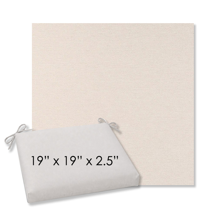 19" x 19" x 2.5" Thick - Universal outdoor dining chair seat cushion in Sunbrella Solution Dyed Polyester Outdoor Fabrics. Features with generous fabric ties and outdoor foam with polyester fiber fill—perfect for most patio dining chairs. Each Outdoor Patio Dining Chair Cushion is a center seam design and 2.5" Thick. All patio dining chair cushions are custom made to order in the size and fabric of your choice.