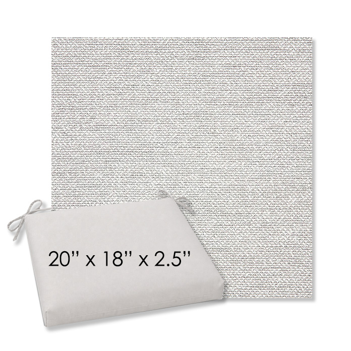 20" x 18" x 2.5" Thick - Universal outdoor dining chair seat cushion in Sunbrella Solution Dyed Polyester Outdoor Fabrics. Features with generous fabric ties and outdoor foam with polyester fiber fill—perfect for most patio dining chairs. Each Outdoor Patio Dining Chair Cushion is a center seam design and 2.5" Thick. All patio dining chair cushions are custom made to order in the size and fabric of your choice.
