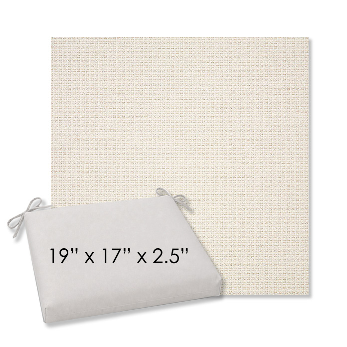 19" x 17" x 2.5" Thick - Universal outdoor dining chair seat cushion in Sunbrella Solution Dyed Polyester Outdoor Fabrics. Features with generous fabric ties and outdoor foam with polyester fiber fill—perfect for most patio dining chairs. Each Outdoor Patio Dining Chair Cushion is a center seam design and 2.5" Thick. All patio dining chair cushions are custom made to order in the size and fabric of your choice.
