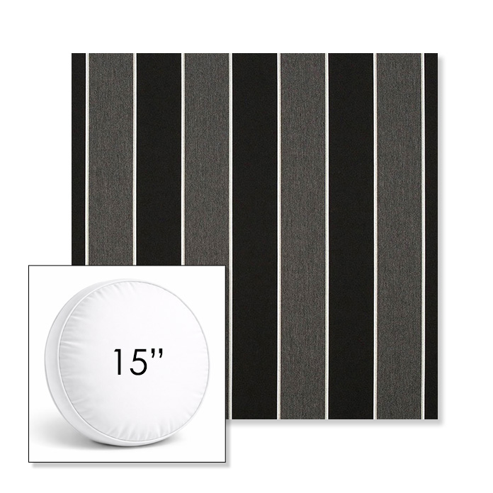 Custom 15" Round Boxed Sunbrella® Outdoor Pillow (3" Thick) available in over 700 Sunbrella® fabrics. Comes standard with piping. Optional covered button detail. Each pillow includes a zipper opening and premium outdoor insert for comfort, durability, and long-lasting outdoor performance.