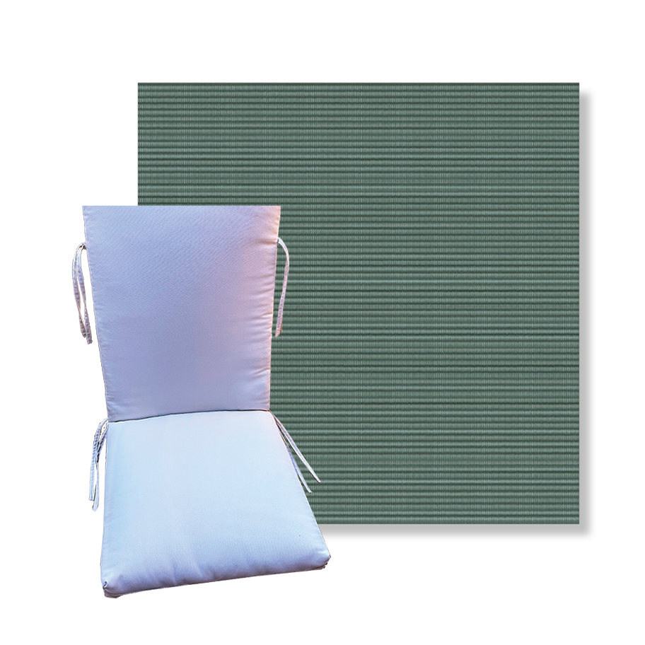Order universal patio chair cushions in Phifertex Sling Fabrics - Find a new colorful replacement cushion in 9 sizes - This style of patio chair cushion features a center seam, hinged design with fabric ties. These outdoor cushions are custom made to order in the fabric and size you need.