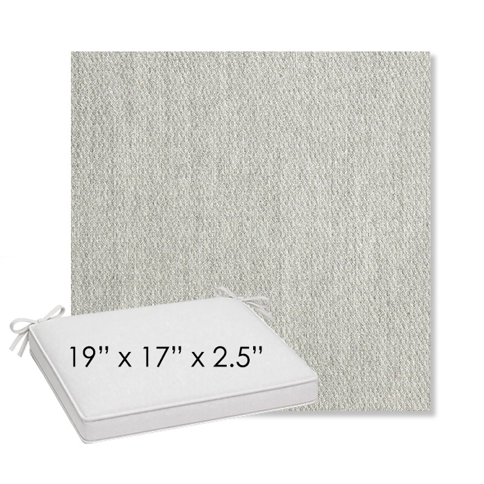 19" x 17" x 2.5" Thick outdoor dining chair seat cushion designed for a simple, ready-to-order fit. Features a boxed construction with piping, fabric ties, and zipper opening. Made in 700+ Sunbrella® fabrics for long-lasting outdoor performance.