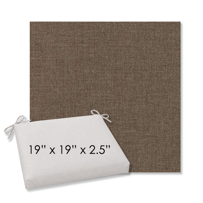 19" x 19" x 2.5" Thick - Universal outdoor dining chair seat cushion in Sunbrella Solution Dyed Polyester Outdoor Fabrics. Features with generous fabric ties and outdoor foam with polyester fiber fill—perfect for most patio dining chairs. Each Outdoor Patio Dining Chair Cushion is a center seam design and 2.5" Thick. All patio dining chair cushions are custom made to order in the size and fabric of your choice.