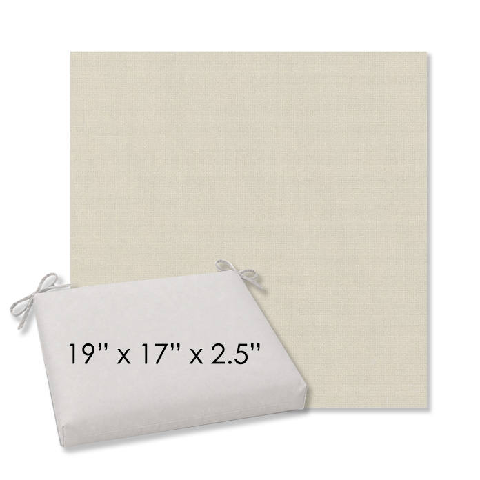 19" x 17" x 2.5" Thick - Universal outdoor dining chair seat cushion in Sunbrella Solution Dyed Polyester Outdoor Fabrics. Features with generous fabric ties and outdoor foam with polyester fiber fill—perfect for most patio dining chairs. Each Outdoor Patio Dining Chair Cushion is a center seam design and 2.5" Thick. All patio dining chair cushions are custom made to order in the size and fabric of your choice.
