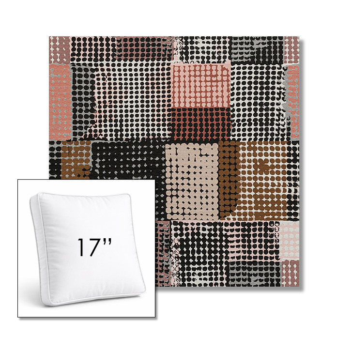 Custom 17" Square Boxed Sunbrella® Outdoor Pillow (3" Thick) available in over 700 Sunbrella® fabrics. Comes standard with piping. Optional covered button detail. Each pillow includes a zipper opening and premium outdoor insert for comfort, durability, and long-lasting outdoor performance.