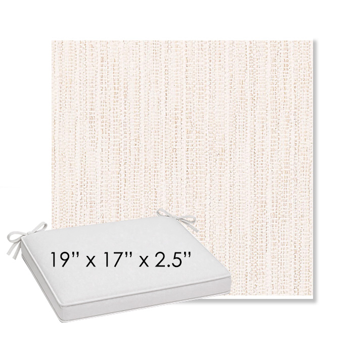 19" x 17" x 2.5" Thick outdoor dining chair seat cushion designed for a simple, ready-to-order fit. Features a boxed construction with piping, fabric ties, and zipper opening. Made in 700+ Sunbrella® fabrics for long-lasting outdoor performance.