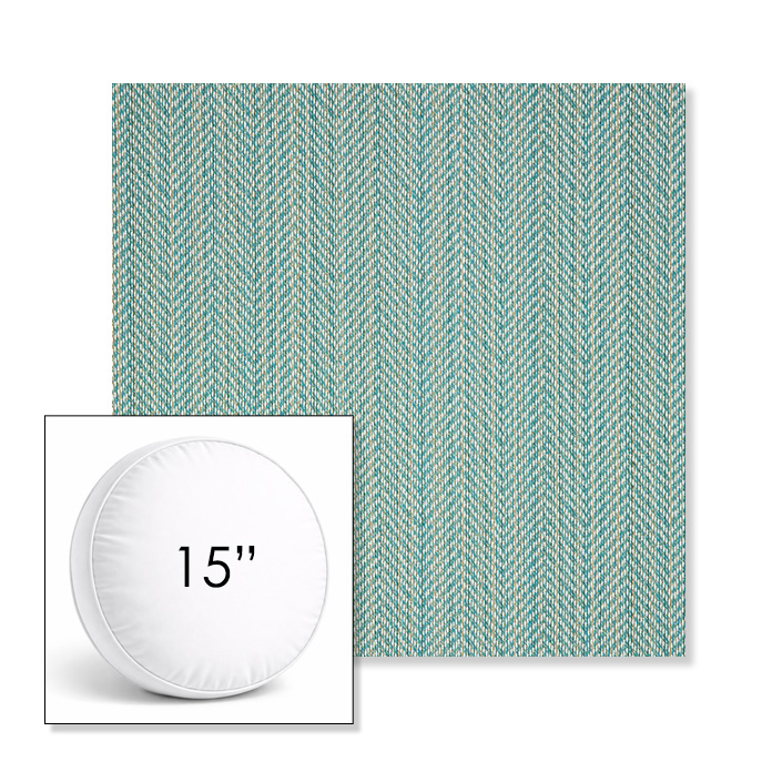 Custom 15" Round Boxed Sunbrella® Outdoor Pillow (3" Thick) available in over 700 Sunbrella® fabrics. Comes standard with piping. Optional covered button detail. Each pillow includes a zipper opening and premium outdoor insert for comfort, durability, and long-lasting outdoor performance.