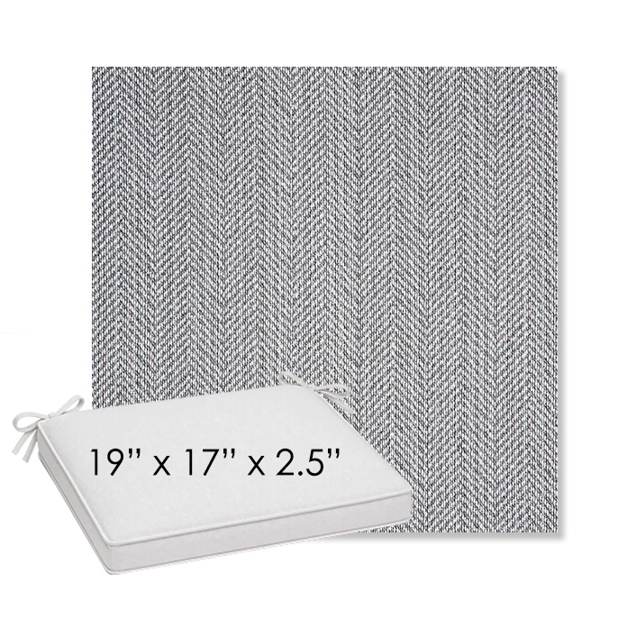 19" x 17" x 2.5" Thick outdoor dining chair seat cushion designed for a simple, ready-to-order fit. Features a boxed construction with piping, fabric ties, and zipper opening. Made in 700+ Sunbrella® fabrics for long-lasting outdoor performance.