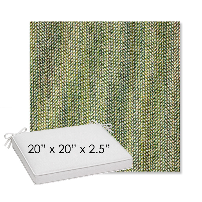 20" x 20" x 2.5" Thick outdoor dining chair seat cushion designed for a simple, ready-to-order fit. Features a boxed construction with piping, fabric ties, and zipper opening. Made in 700+ Sunbrella® fabrics for long-lasting outdoor performance.