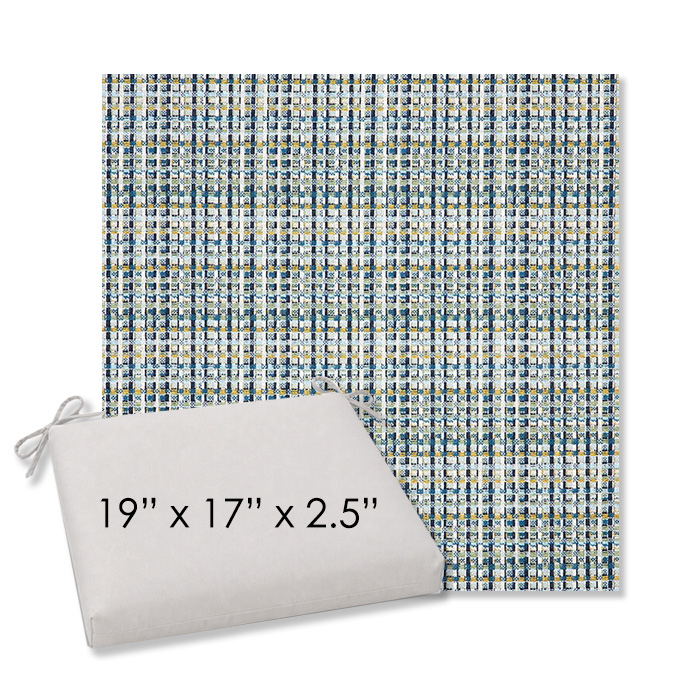 19" x 17" x 2.5" Thick - Universal outdoor dining chair seat cushion in Sunbrella Solution Dyed Polyester Outdoor Fabrics. Features with generous fabric ties and outdoor foam with polyester fiber fill—perfect for most patio dining chairs. Each Outdoor Patio Dining Chair Cushion is a center seam design and 2.5" Thick. All patio dining chair cushions are custom made to order in the size and fabric of your choice.