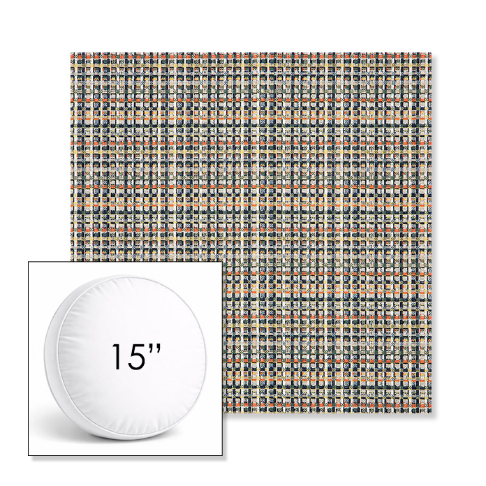 Custom 15" Round Boxed Sunbrella® Outdoor Pillow (3" Thick) available in over 700 Sunbrella® fabrics. Comes standard with piping. Optional covered button detail. Each pillow includes a zipper opening and premium outdoor insert for comfort, durability, and long-lasting outdoor performance.
