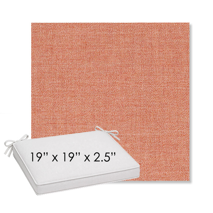 19" x 19" x 2.5" Thick outdoor dining chair seat cushion designed for a simple, ready-to-order fit. Features a boxed construction with piping, fabric ties, and zipper opening. Made in 700+ Sunbrella® fabrics for long-lasting outdoor performance.