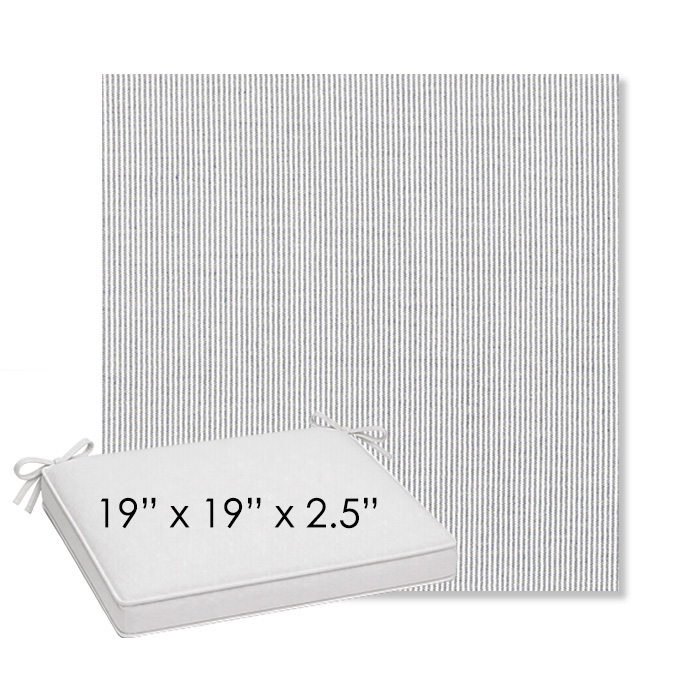 19" x 19" x 2.5" Thick outdoor dining chair seat cushion designed for a simple, ready-to-order fit. Features a boxed construction with piping, fabric ties, and zipper opening. Made in 700+ Sunbrella® fabrics for long-lasting outdoor performance.