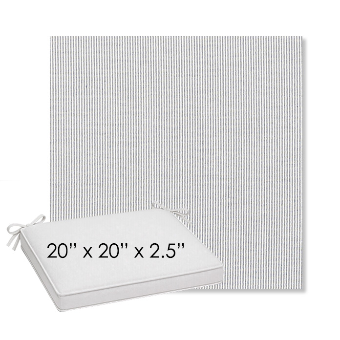 20" x 20" x 2.5" Thick outdoor dining chair seat cushion designed for a simple, ready-to-order fit. Features a boxed construction with piping, fabric ties, and zipper opening. Made in 700+ Sunbrella® fabrics for long-lasting outdoor performance.