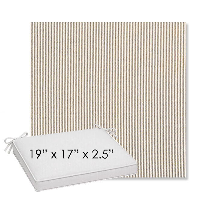 19" x 17" x 2.5" Thick outdoor dining chair seat cushion designed for a simple, ready-to-order fit. Features a boxed construction with piping, fabric ties, and zipper opening. Made in 700+ Sunbrella® fabrics for long-lasting outdoor performance.