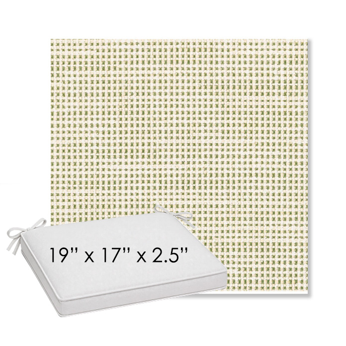 19" x 17" x 2.5" Thick outdoor dining chair seat cushion designed for a simple, ready-to-order fit. Features a boxed construction with piping, fabric ties, and zipper opening. Made in 700+ Sunbrella® fabrics for long-lasting outdoor performance.
