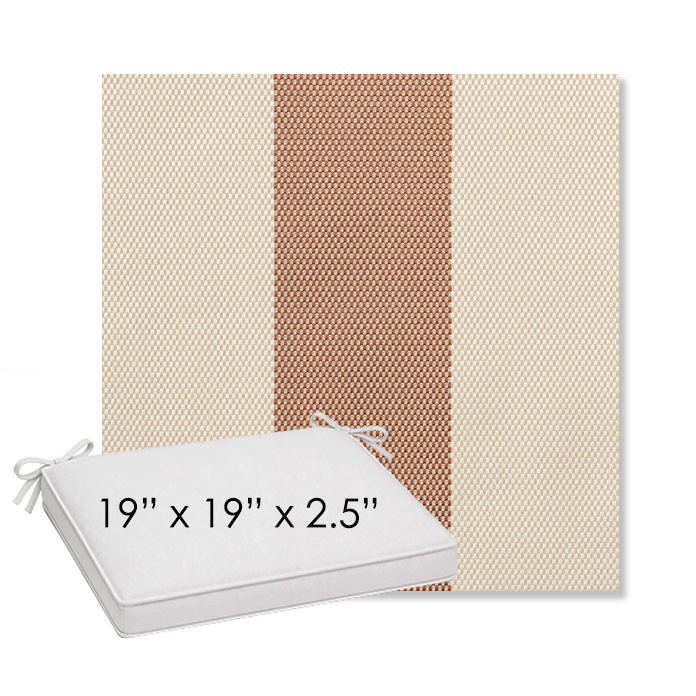 19" x 19" x 2.5" Thick outdoor dining chair seat cushion designed for a simple, ready-to-order fit. Features a boxed construction with piping, fabric ties, and zipper opening. Made in 700+ Sunbrella® fabrics for long-lasting outdoor performance.