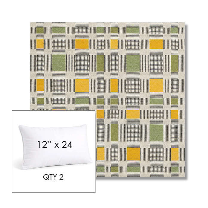 Custom 12" x 24" Lumbar Pillow SET OF TWO, square outdoor pillows available in over 700 Sunbrella® fabrics. Choose piping or knife-edge finish with optional covered button detail. Each pillow includes a zipper opening and premium outdoor insert for comfort, durability, and long-lasting outdoor performance.