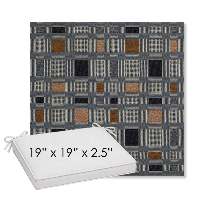 19" x 19" x 2.5" Thick outdoor dining chair seat cushion designed for a simple, ready-to-order fit. Features a boxed construction with piping, fabric ties, and zipper opening. Made in 700+ Sunbrella® fabrics for long-lasting outdoor performance.