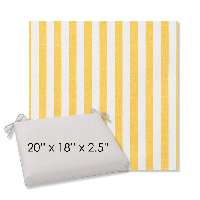 20" x 18" x 2.5" Thick - Universal outdoor dining chair seat cushion in Sunbrella Solution Dyed Polyester Outdoor Fabrics. Features with generous fabric ties and outdoor foam with polyester fiber fill—perfect for most patio dining chairs. Each Outdoor Patio Dining Chair Cushion is a center seam design and 2.5" Thick. All patio dining chair cushions are custom made to order in the size and fabric of your choice.