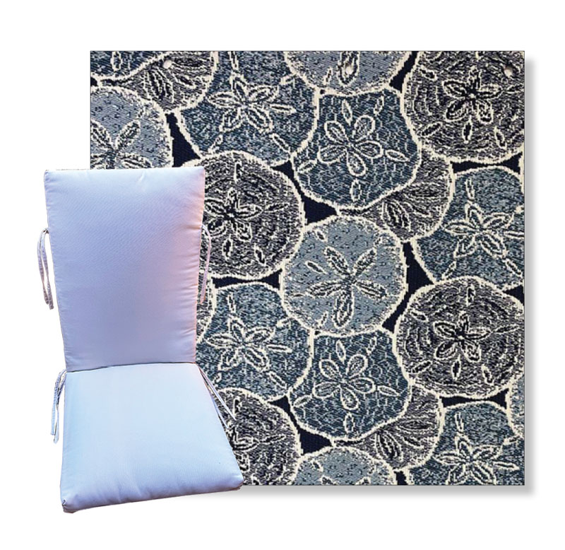 Order universal patio chair cushions in Revolution Outdoor Fabrics - Find a new colorful replacement cushion in 9 sizes - This style of patio chair cushion features a center seam, hinged design with fabric ties. These outdoor cushions are custom made to order in the fabric and size you need.